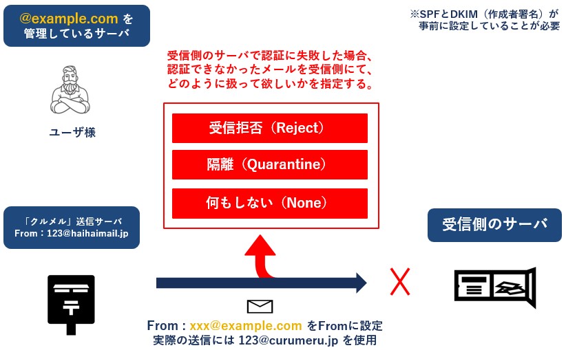 送ったメールが受信先にて認証に失敗した場合に「破棄」,「隔離」,「受信拒否」より
