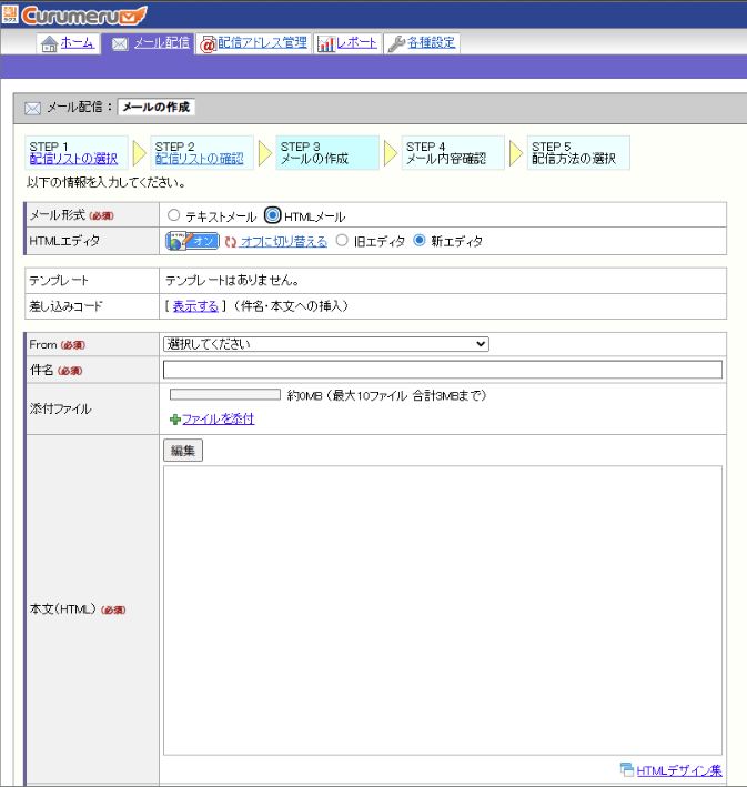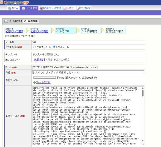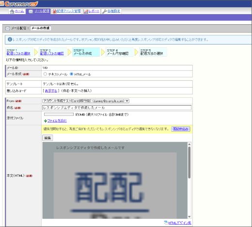 メール形式に「HTML(レスポンシブ対応エディタ)」と表示されます。
