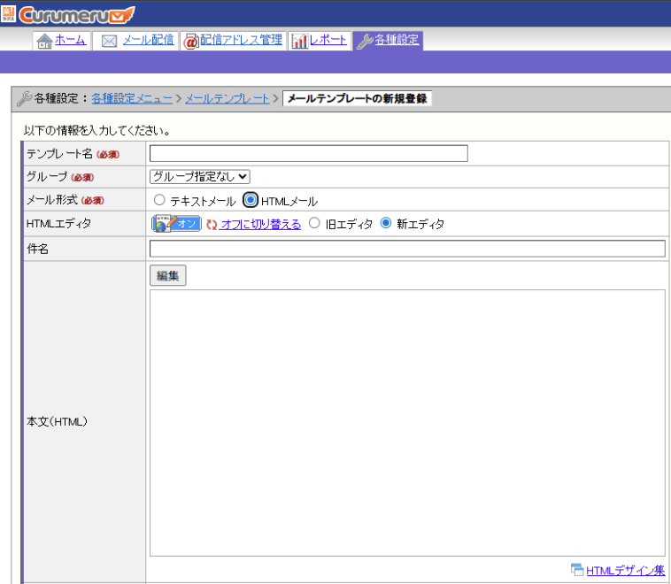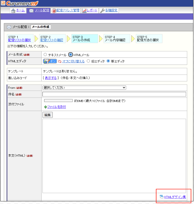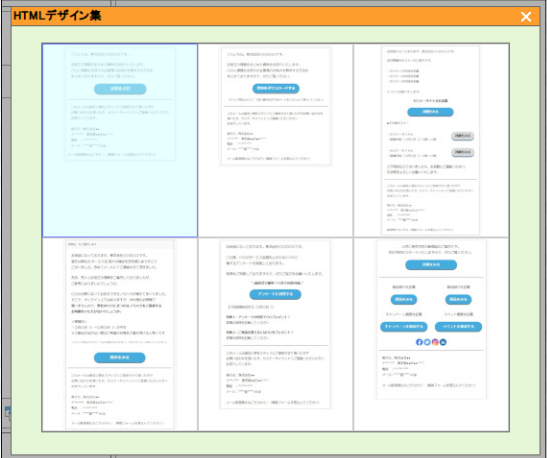 ・本文(HTML)の右下の「HTMLデザイン集」のリンクをクリックするとデフォルトのHTMLデザインを使用することができます。