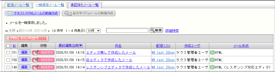 ※ 編集する際は「一時保存メール一覧」から該当メールの「編集」をクリックします。
